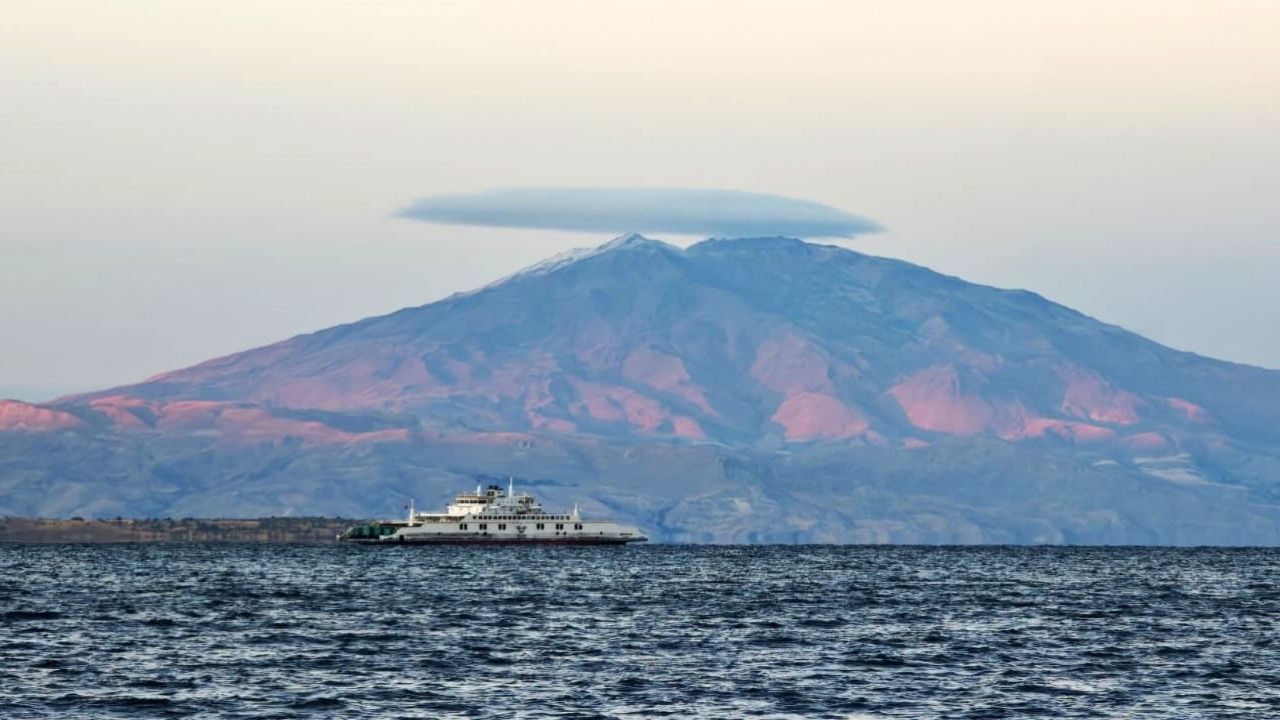 Bitlis’in görkemli simgelerinden biri olan ve 4 bin 58 rakımı ile Türkiye’nin üçüncü yüksek dağı olan Süphan Dağı, doğa tutkunlarını büyüleyen eşsiz bir manzaraya sahne oldu. Akşam saatlerinde dağın zirvesini saran mercek bulutu, Tatvan sahilinden fotoğraflandı. Van Gölü’nün masmavi suları ve üzerinde seyreden feribotla birlikte Süphan Dağı’nın manzarası hayranlık uyandırdı.
