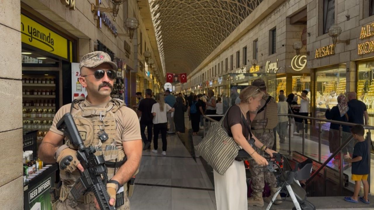 Çelik yelekli, otomatik silahlı özel harekat timleri Kapalıçarşı’nın giriş çıkışlarında ve kalabalık noktalarda sürekli devriye geziyor. Güvenliğin en üst seviyeye çıktığı Kapalıçarşı’da, tarihi dokuya eşlik eden özel harekat manzarası ziyaretçilerin ve turistlerin dikkatini çekiyor, cep telefonlarıyla da kaydediliyor.