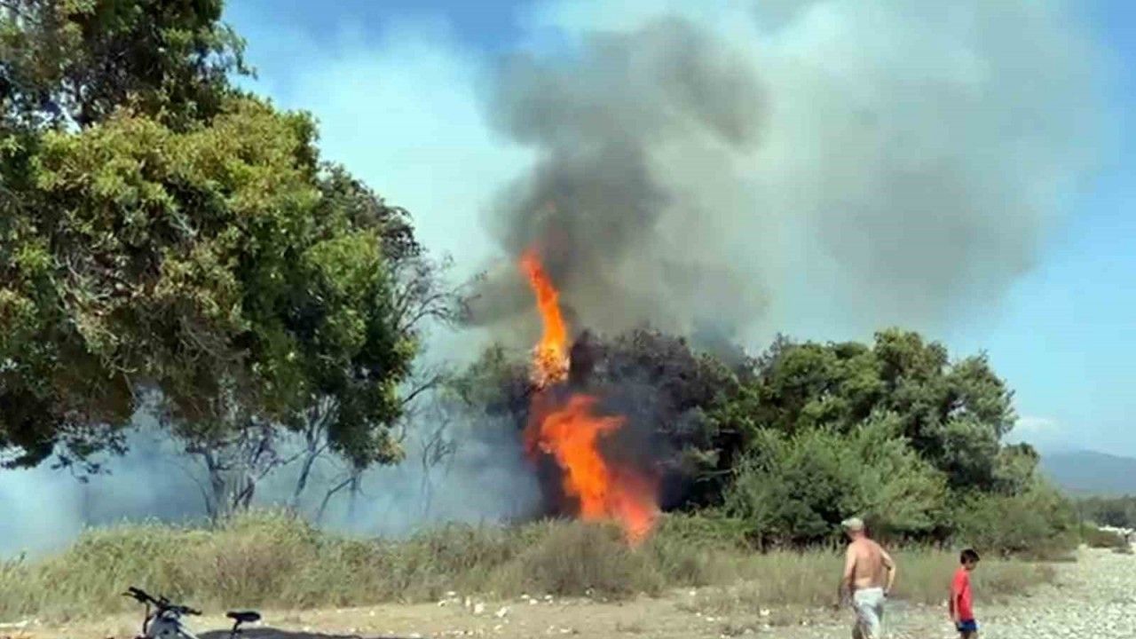 Fethiye’nin günübirlik tatil koylarından Karaot Aymaz sahilinde iki gün önce sahile yakın bölgede orman yangını çıktı. Yangına ilk müdahale sahilde bulunan tatilciler elleri ile toprakları alevlerin üzerine atması ile başladı.