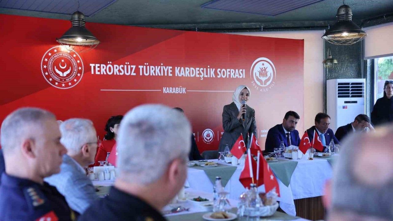 Aile ve Sosyal Hizmetler Bakanı Mahinur Özdemir Göktaş, Cumhurbaşkanı Recep Tayyip Erdoğan’ın liderliğinde başlatılan ‘terörsüz Türkiye’ süreci kapsamında Türkiye’nin dört bir yanında şehit aileleri ve gazilerin yanı sıra sivil toplum kuruluşları temsilcileri ve kanaat önderleriyle bir araya gelmeye devam ediyor. Karabük’te şehit aileleriyle ‘Terörsüz Türkiye Kardeşlik Sofrası’nda buluşan Göktaş, Cumhurbaşkanı Erdoğan’ın selamlarını ileterek, ailelerle yakından ilgilendi. Bakan Göktaş, programda yaptığı konuşmada, "Burada özellikle vurgulamak isterim ki hiçbir şekilde bu süreçte herhangi bir pazarlık, şehitlerimizin emanetine, aziz hatıralarına gölge düşürecek hiçbir konunun gündeme gelmediğini ve bizlerin buna asla fırsat vermeyeceğimizi özellikle ifade etmek istiyorum. Sizler bizim başımızın tacısınız" dedi.