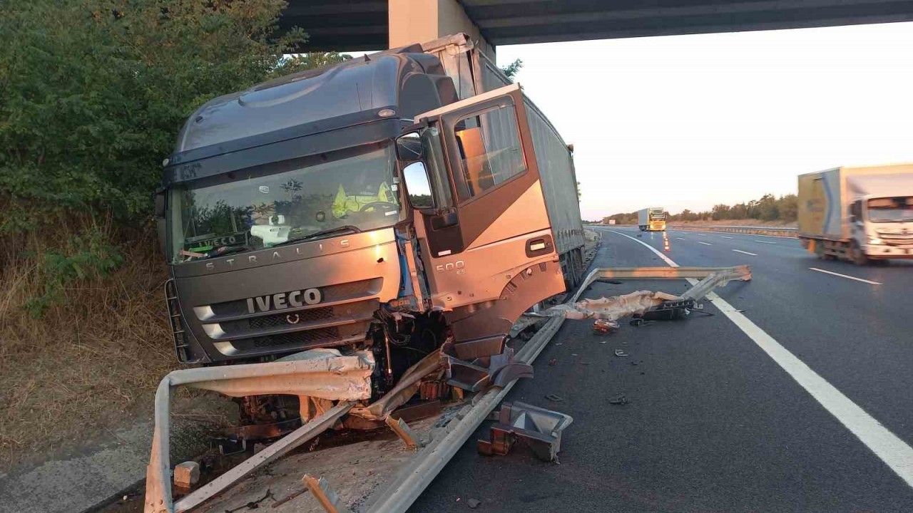 Edirne-İstanbul TEM Otoyolu’nun 62’nci kilometresinde meydana gelen kazada, Bulgaristan plakalı bir tır bariyerlere çarptı.