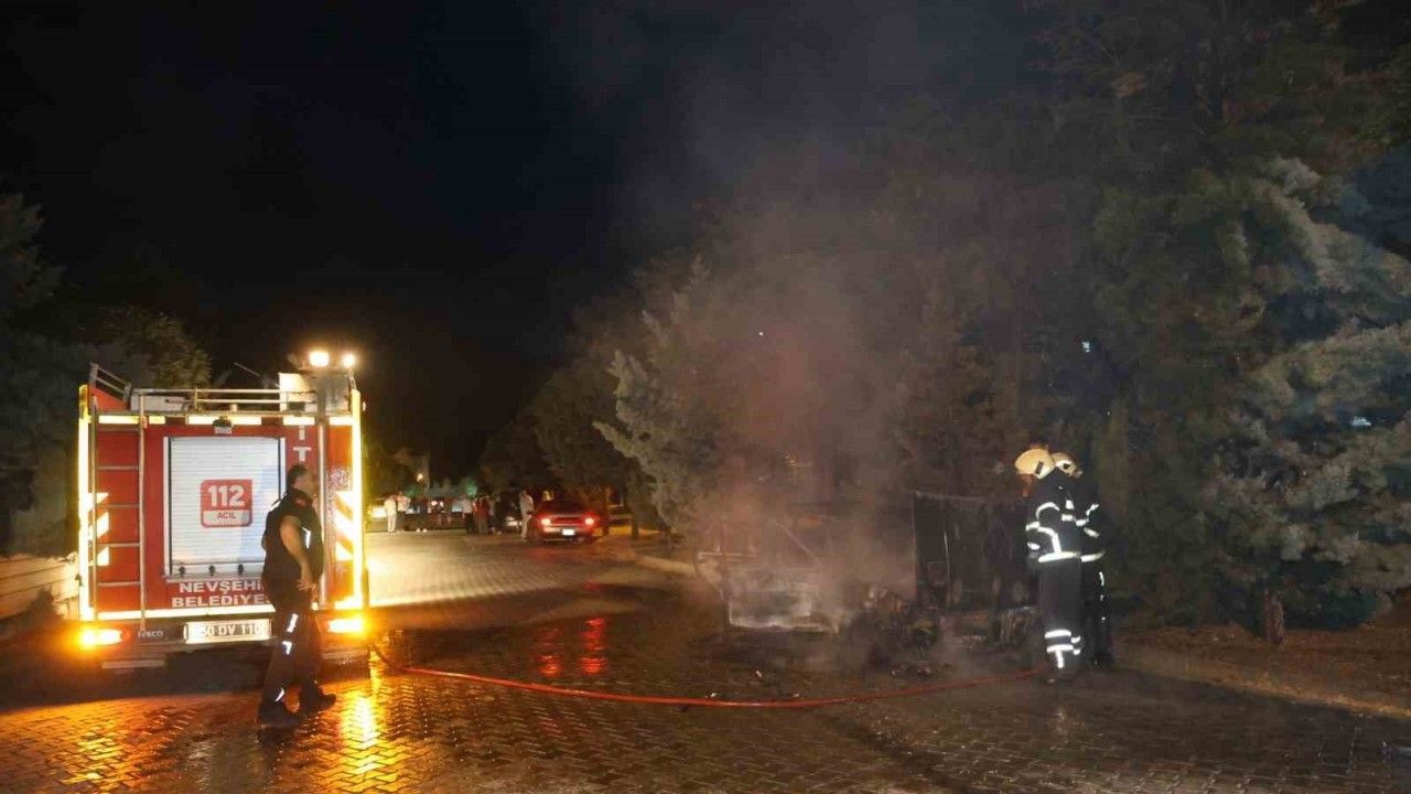 Nevşehir’de Tofaş otomobil park edildikten kısa bir süre sonra yanmaya başladı. Yanan otomobil iki dakika içinde alev topuna döndü.