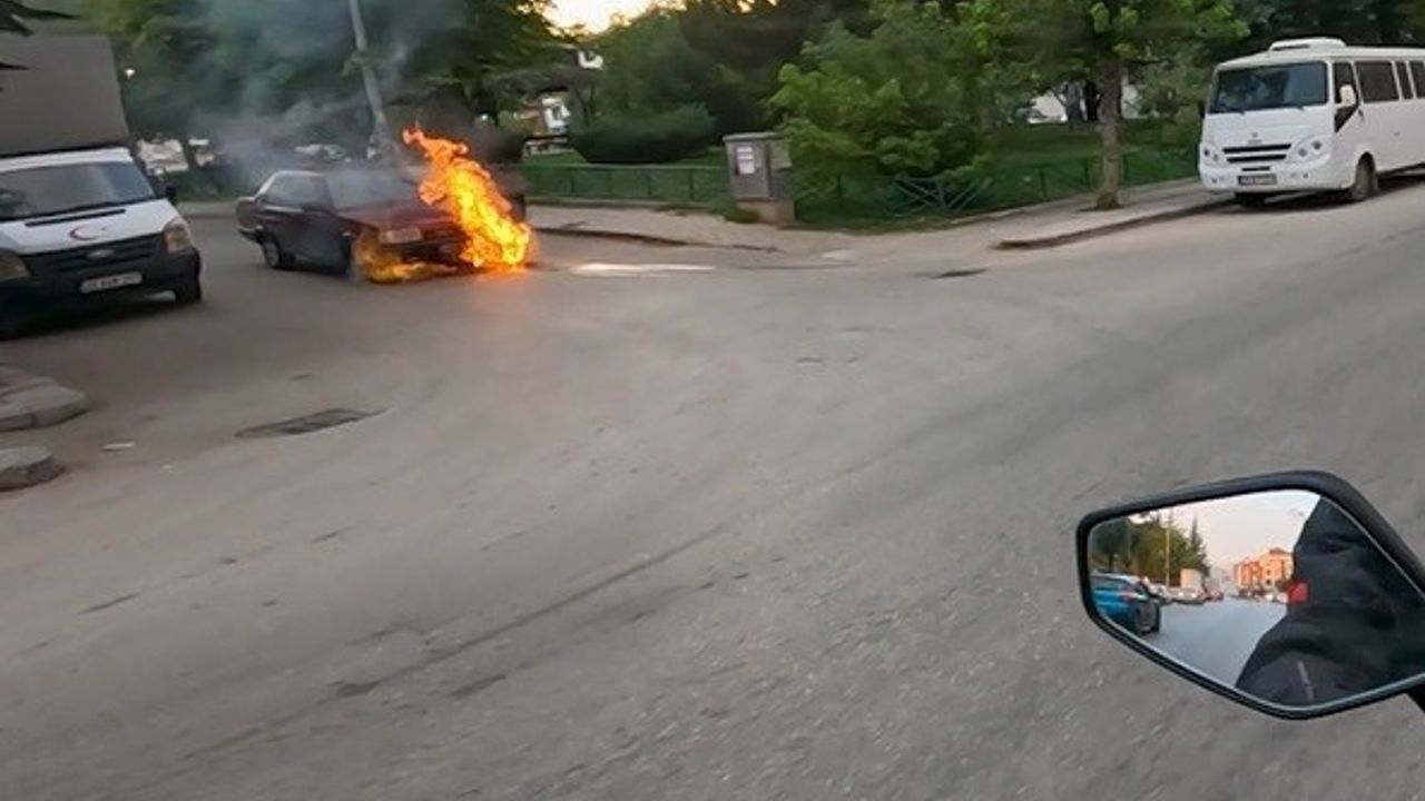 Eskişehir’de Tofaş marka aracın alev alev yanma anı, oradan geçen bir motosiklet kullanıcısının kask kamerasına yansıdı.