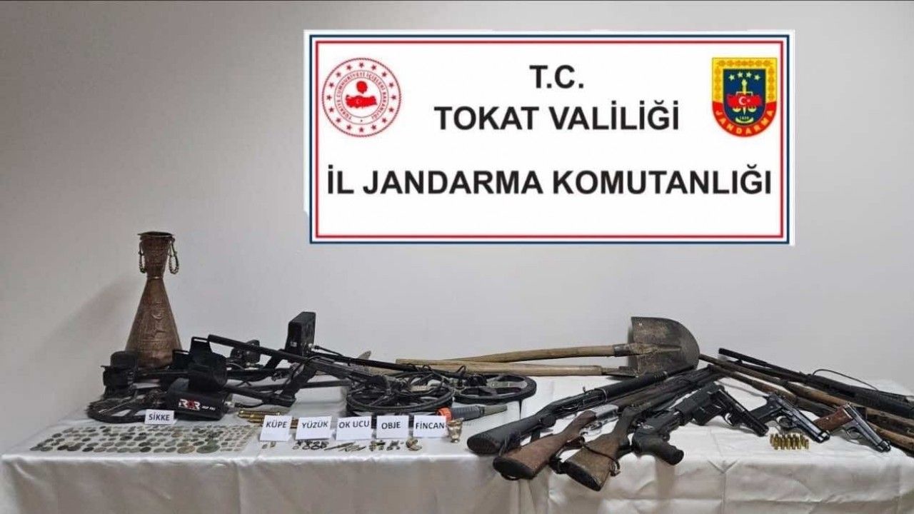 Tokat İl Jandarma Komutanlığınca tarihi eser kaçakçılığına yönelik yürütülen çalışmalar kapsamında Tokat Merkez ilçesinde operasyon düzenlendi. Bir şahsın tarihi eser kaçakçılığı yaptığı yönünde alınan ihbar üzerine harekete geçen jandarma ekipleri, şüpheliyi kaçak kazı yaptığı sırada suçüstü yakaladı. Adli mercilerden alınan arama kararına istinaden şüphelinin ikametinde yapılan aramalarda; 144 sikke, 4 ok ucu, 8 yüzük, 1 küpe, 1 bronz obje, 10 çeşitli obje, 1 fincan, 1 vazo, 2 arama detektörü, 2 ruhsatsız tabanca, 1 kuru sıkı tabanca, 7 ruhsatsız av tüfeği, 1 havalı tüfek ve 18 tabanca mermisi ele geçirildi. Ele geçirilen tarihi eser ve silahlar muhafaza altına alınırken, şüpheli şahıs hakkında adli işlem başlatıldı. Tokat İl Jandarma Komutanlığı, kültürel mirasın korunmasına yönelik çalışmaların kararlılıkla sürdürüleceğini bildirdi.