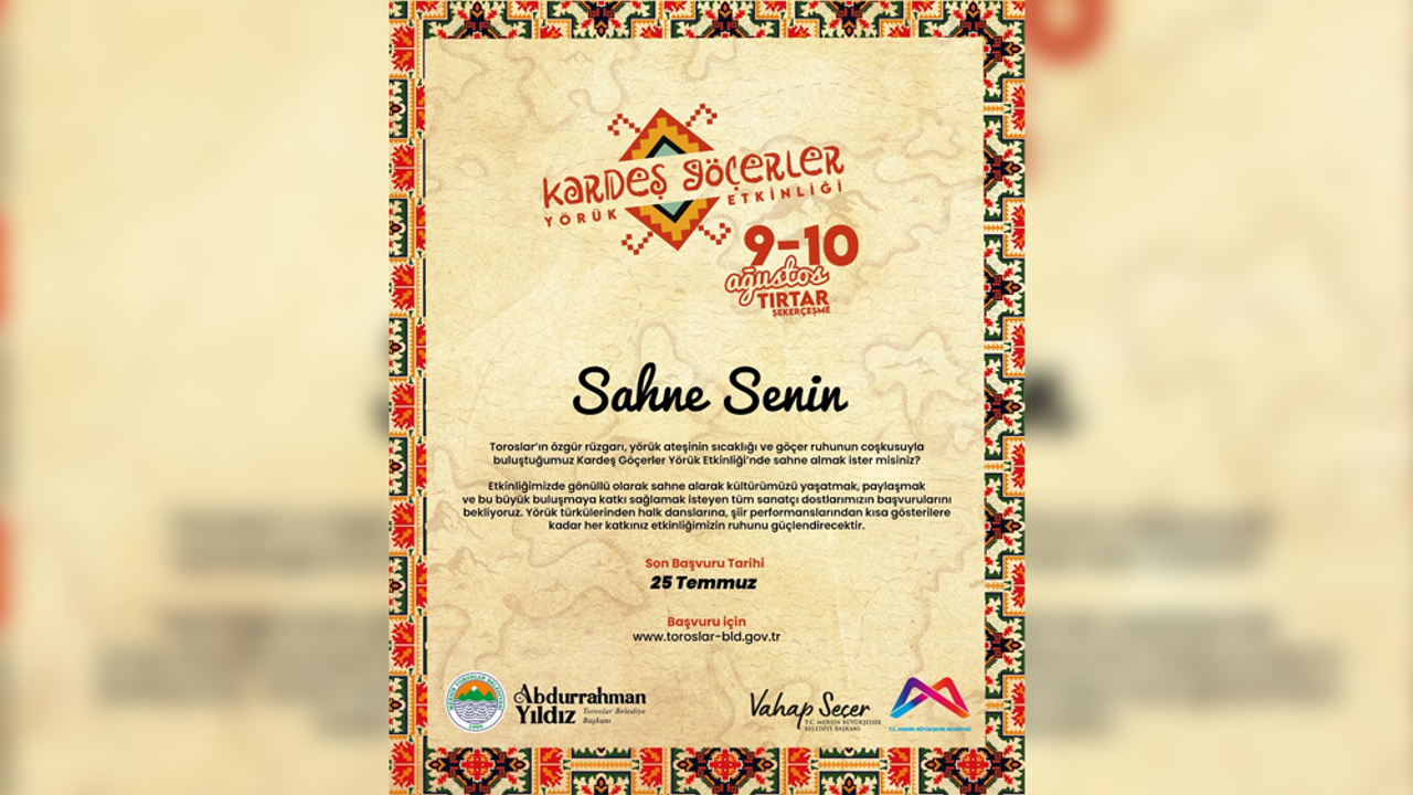 Toroslar Belediyesi'nden yapılan resmi duyuruda, "Toroslar’ın özgür rüzgarı, Yörük ateşinin sıcaklığı ve göçer ruhunun coşkusuyla buluştuğumuz Kardeş Göçerler Yörük Etkinliği’nde sahne almak ister misiniz? Etkinliğimizde gönüllü olarak sahne alarak kültürümüzü yaşatmak, paylaşmak ve bu büyük buluşmaya katkı sağlamak isteyen tüm sanatçı dostlarımızın başvurularını bekliyoruz. Yörük türkülerinden halk danslarına, şiir performanslarından kısa gösterilere kadar her katkınız etkinliğimizin ruhunu güçlendirecektir" ifadelerine yer verildi.
