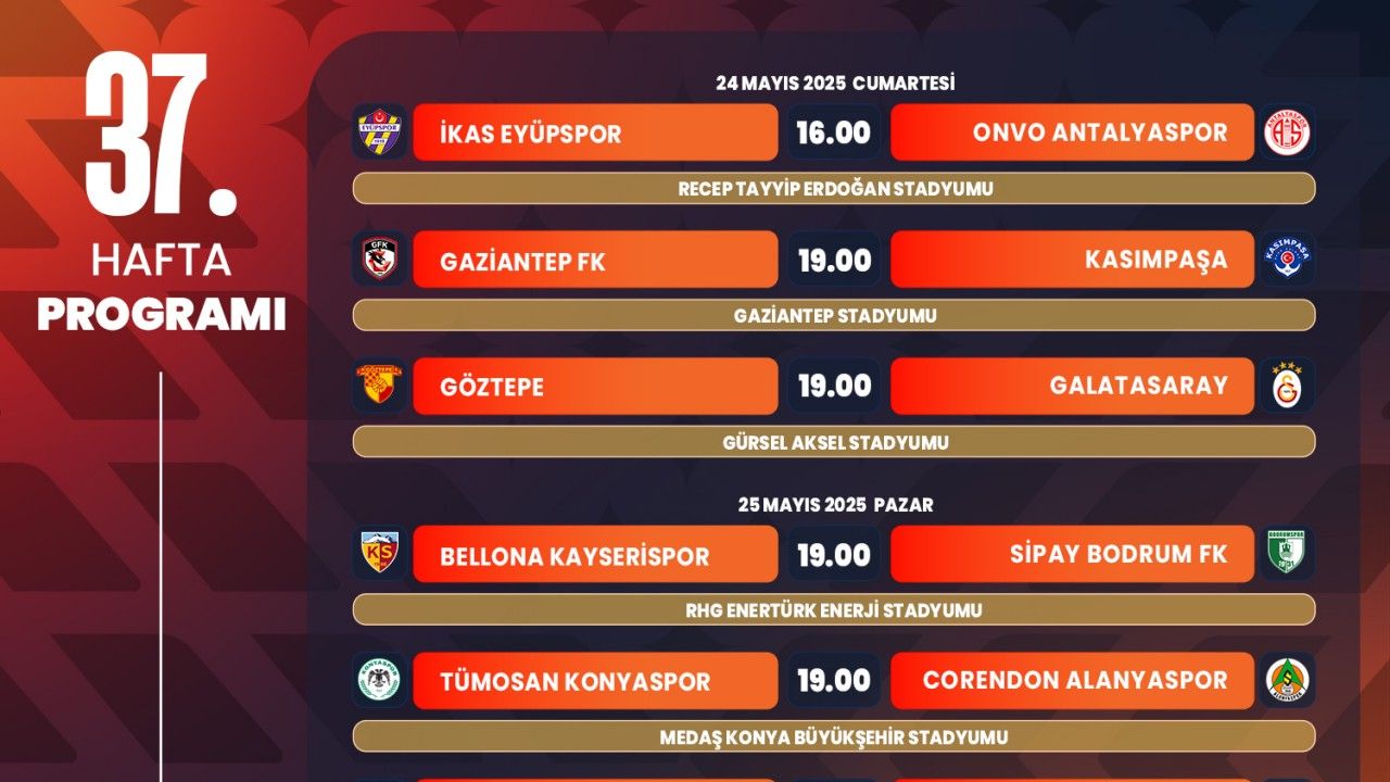 Türkiye Futbol Federasyonu (TFF), Trendyol Süper Lig’de 37. haftanın programını duyurdu. TFF’nin sitesinden yapılan açıklamaya göre, 24 Mayıs Cumartesi günü saat 16.00’da Eyüpspor ile Antalyaspor arasında oynanacak müsabakayla başlayacak olan hafta, 26 Mayıs Pazartesi günü saat 20.00’de Hatayspor - Fenerbahçe müsabakasıyla tamamlanacak.