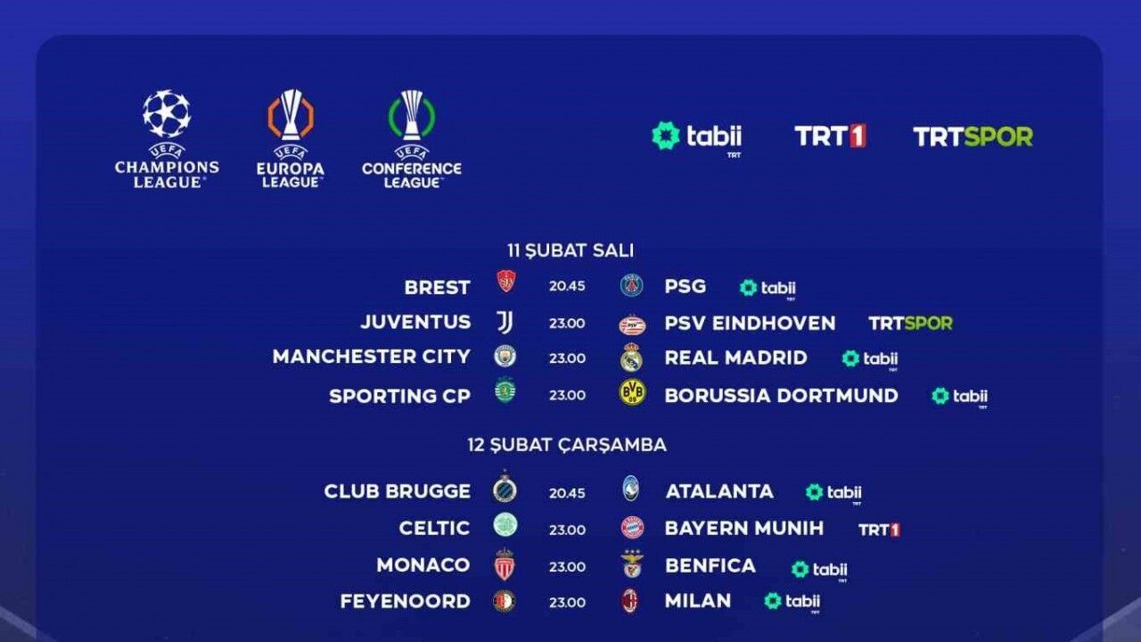 UEFA Şampiyonlar, Avrupa ve Konferans Ligi’nde 11,12 ve 13 Şubat tarihlerinde oynanacak 21 karşılaşma canlı yayınla TRT 1, TRT Spor, TRT Radyo 1 ve tabii platformundan futbolseverlerle buluşacak.