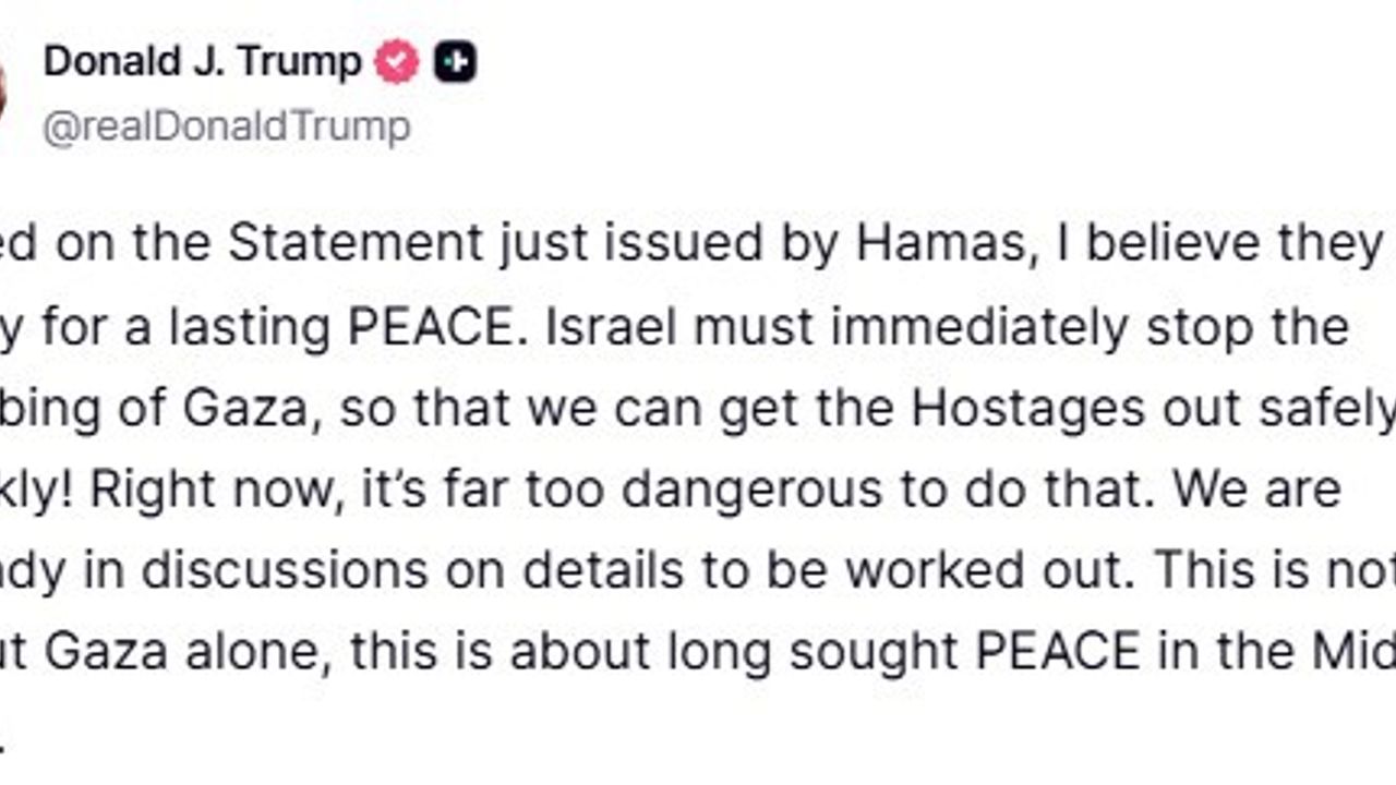 ABD Başkanı Donald Trump, Hamas’ın kalıcı bir barışa hazır olduğuna inandığını belirterek, "İsrail, Gazze’yi bombalamayı derhal durdurmalı ki; rehineleri güvenli ve hızlı bir şekilde bölgeden çıkarabilelim! Ortam, şu anda bunu yapmak için çok tehlikeli" açıklamasında bulundu.