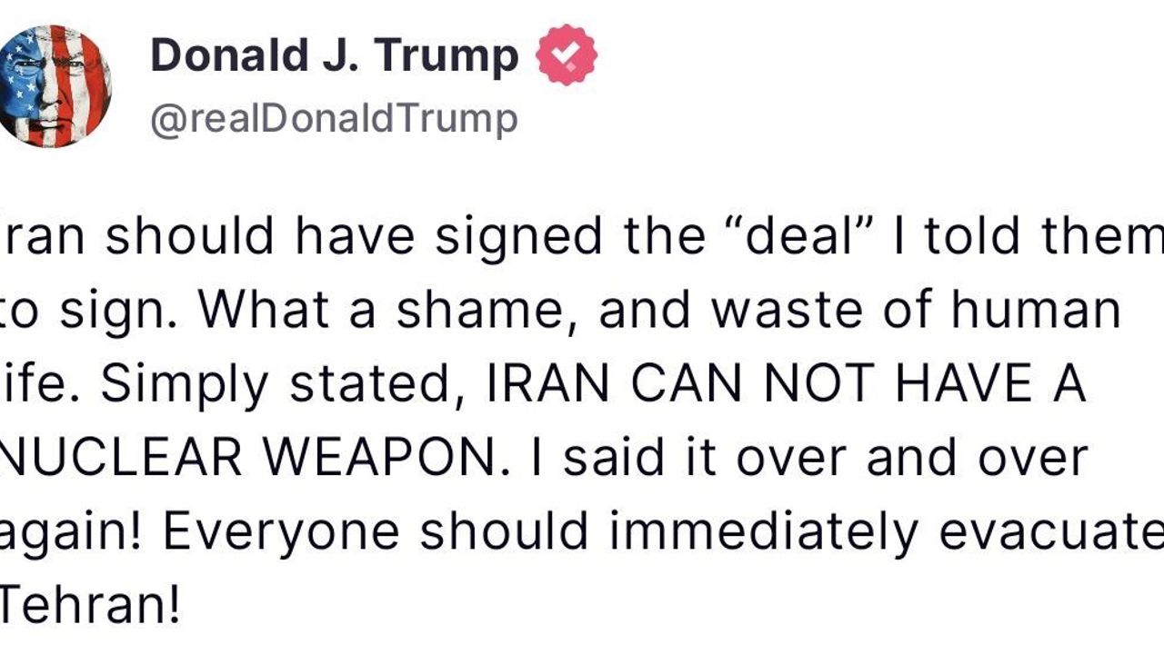 ABD Başkanı Donald Trump, kendisine ait Truth Social adlı sosyal paylaşım sitesi üzerinden bir açıklama yayınlayarak İran’ın başkenti Tahran’ın tahliye edilmesi çağrısında bulundu. Açıklamasında Trump, "İran’ın anlaşmaya imza atması gerekiyordu. Onlara imzalamalarını söyledim. Çok yazık oldu ve birçok insan kaybedildi. Açıkça söyledim, İran nükleer silah sahibi olamaz. Bunu defalarca söyledim! Herkes, Tahran’ı acilen tahliye etmeli" diye yazdı.