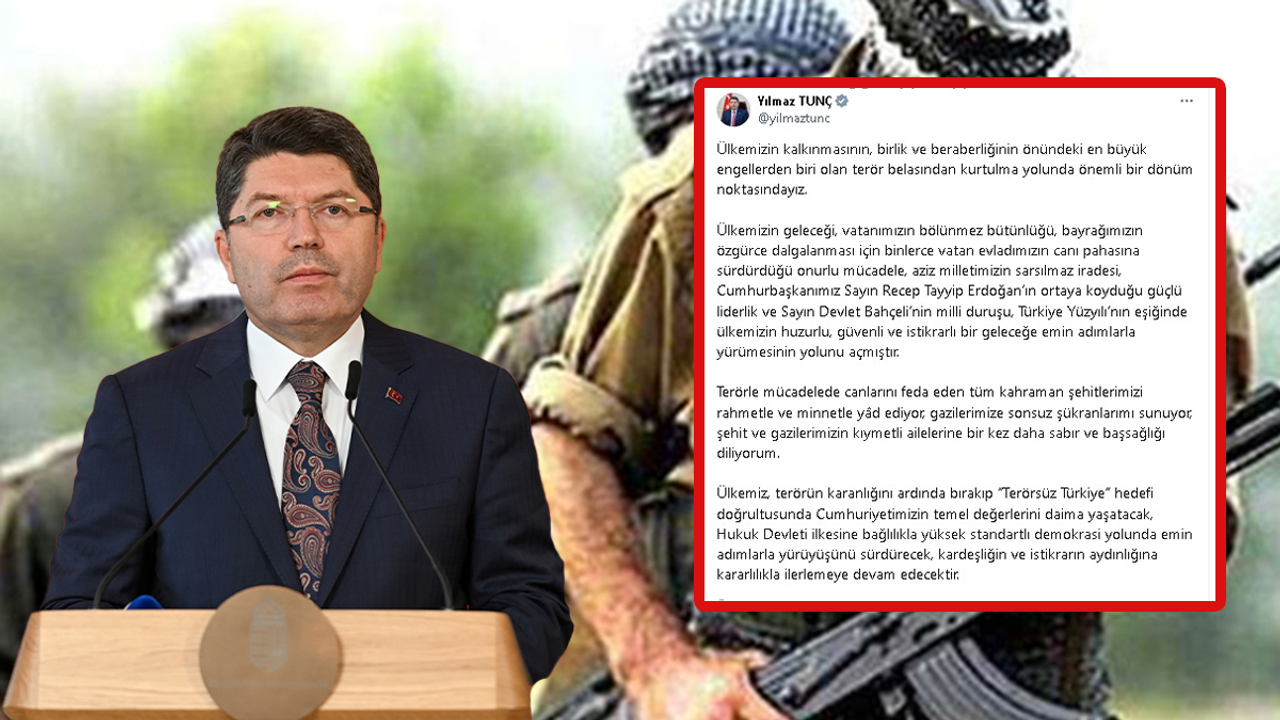 Bakan Tunç, paylaşımında, "Ülkemizin kalkınmasının, birlik ve beraberliğinin önündeki en büyük engellerden biri olan terör belasından kurtulma yolunda önemli bir dönüm noktasındayız" ifadelerini kullandı. Tunç, bu süreçte binlerce vatan evladının canı pahasına sürdürdüğü mücadelenin, milletin iradesinin, Cumhurbaşkanı Recep Tayyip Erdoğan'ın liderliğinin ve Devlet Bahçeli'nin milli duruşunun etkili olduğunu vurguladı.
