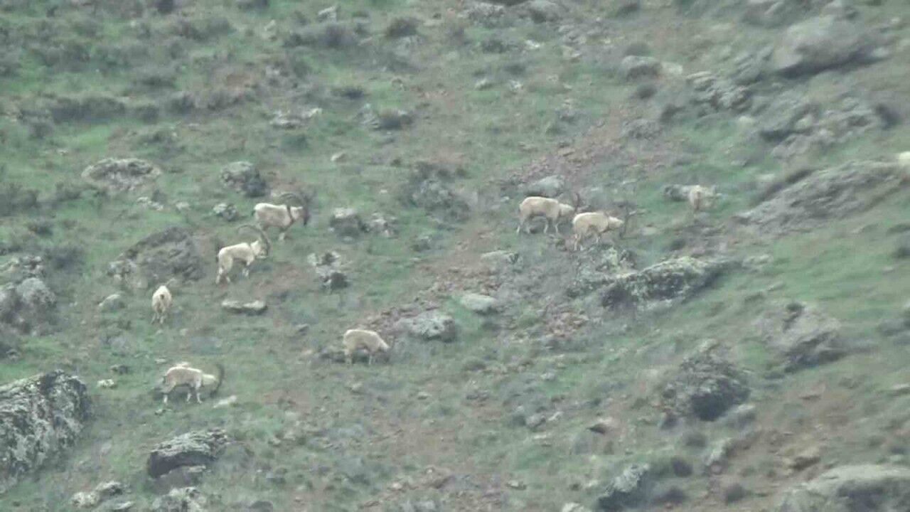 Tunceli’de ilkbaharın gelişiyle birlikte doğa canlanırken yaban hayvanları da karınlarını doyururken daha sık görüntülenmeye başlandı. Tunceli’nin Pülümür ilçesinde nesilleri tehlike altında olduğu için koruma altında bulunan yaban keçileri yeşermeye başlamış çayırlarda sürü halinde karınlarını doyururken görüntülendi.