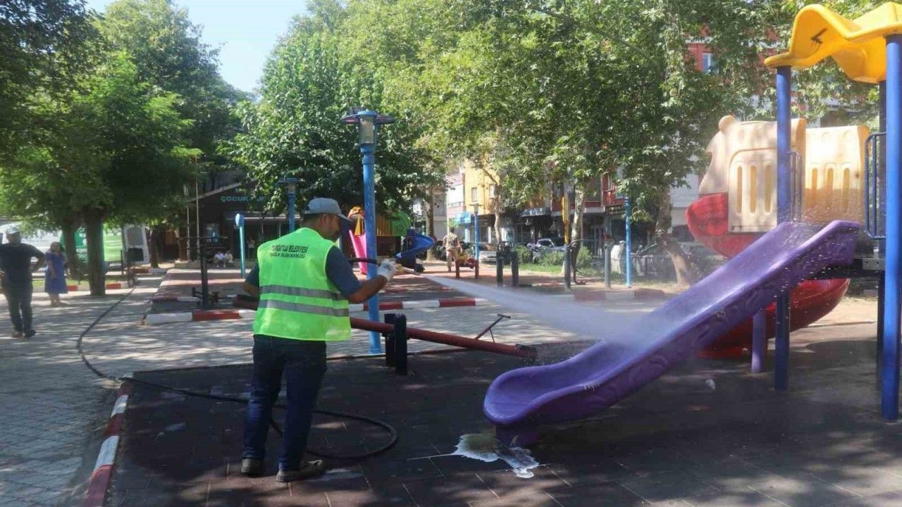 Turgutlu Belediyesi Temizlik İşleri Müdürlüğü gerçekleştirdiği dezenfekte çalışmalarıyla parkları ve çocuk oyun gruplarını temiz ve hijyenik hale getiriyor.