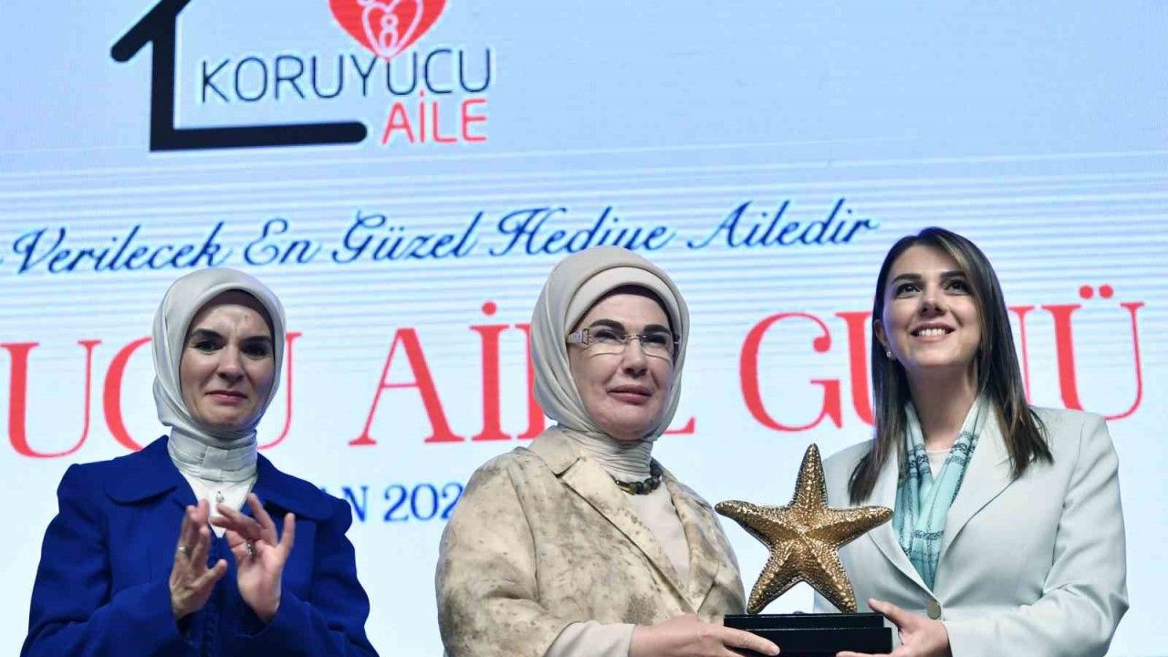 Emine Erdoğan, koruyucu aile çalışmalarında örnek başarı sergileyerek Koruyucu Aile Hizmet Modeli çerçevesinde bu yıl Koruyucu ailelerin himayesi altına emanet edilen çocuk sayısında Türkiye 1. si olan Hatay’ın gönül elçisi, Vali Mustafa Masatlı’nın eşi Esra Masatlı’ya teşekkür ederek plaketler takdim etti.