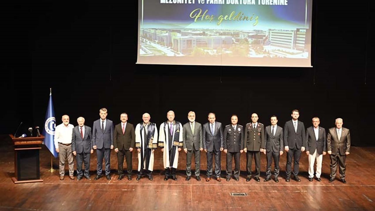 Törende konuşan Uşak Üniversitesi Rektörü Prof. Dr. Ekrem Savaş, "Bugün burada Üniversitemizin 2024-2025 Mezuniyet Töreni ile birlikte Türkiye Büyük Millet Meclisi Milli Savunma Komisyonu Başkanı, AK Parti Kayseri Milletvekili Sayın Dr. Hulusi Akar’a Fahri Doktora unvanı tevdi etmek ve 60, 61 ve 62. Hükümet Enerji ve Tabii Kaynaklar Bakanı Sayın Taner Yıldız’a Onur Belgesi takdim etmek üzere bir araya gelmiş bulunmaktayız’’ dedi.