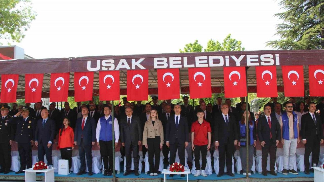 Uşak Valisi Naci Aktaş ve Uşak Belediye Başkanı Özkan Yalım, törene katılan öğrenci, öğretmen ve vatandaşların bayramını kutlamasının ardından törenlere geçildi. Törende öğrencilerin ve sporcuların hazırladıkları halk oyunları, jimnastik, karate gösterisi sergilendi.