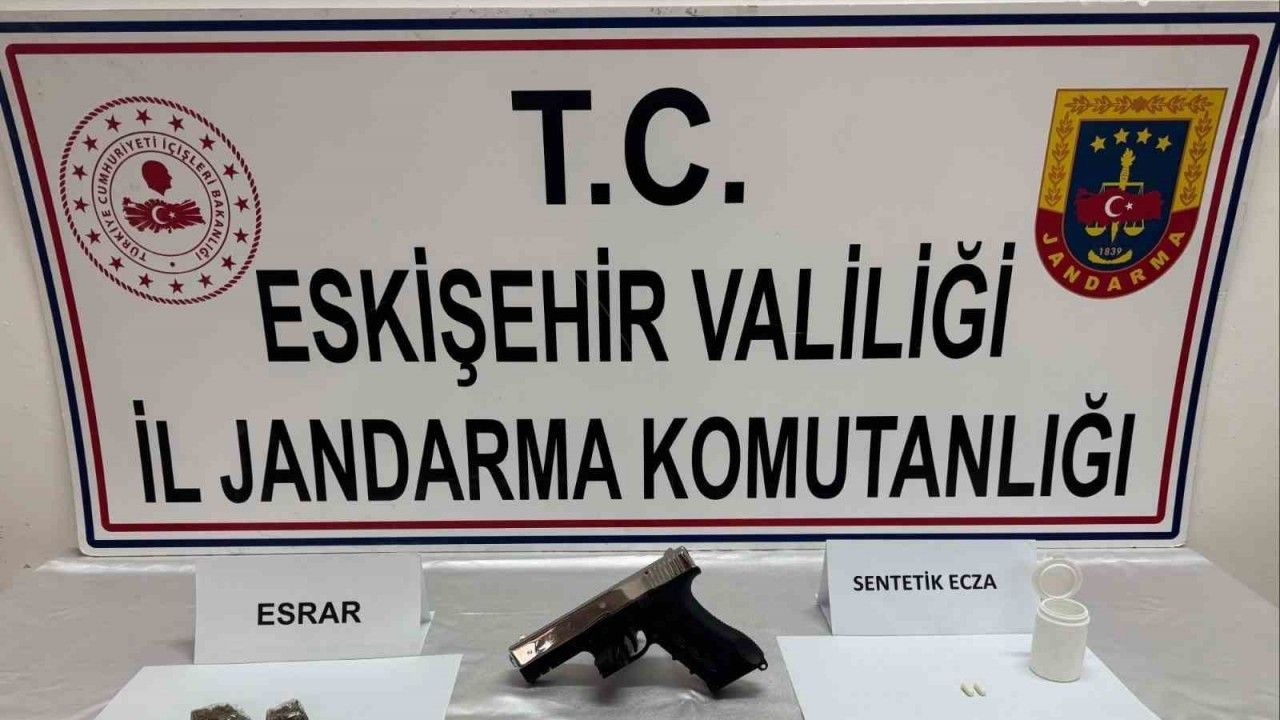 Eskişehir’de jandarma ekiplerince bir şahısın üzerinden ve ikametinde yapılan aramalarda 2 adet sentetik ecza hap, 3 gram esrar maddesi ve 1 adet ruhsatsız tabanca ele geçirildi.