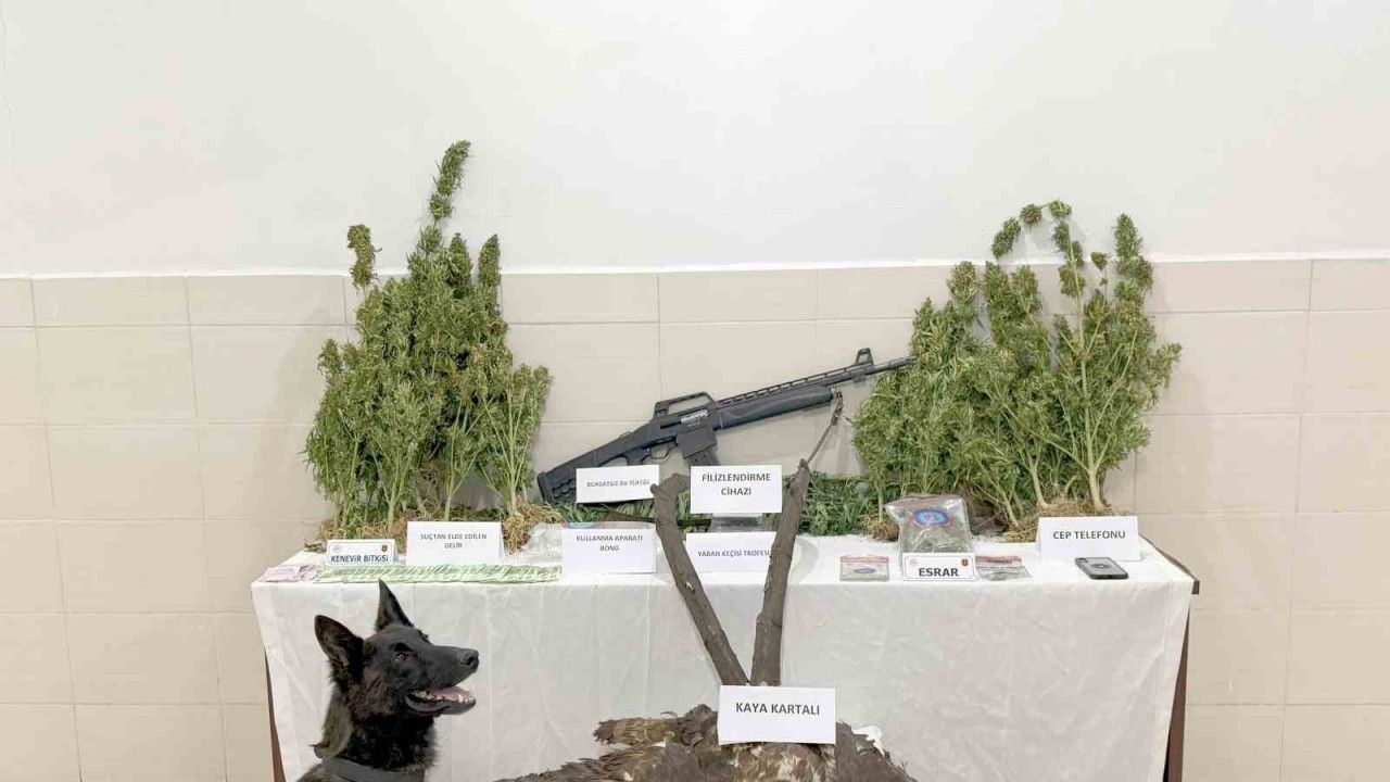 Şahsın evinde ve eklentilerinde yapılan aramalarda 50 kök kenevir bitkisi, 176 gram kubar esrar, 5 bin 900 Euro para, uyuşturucu üretiminde kullanılan filizlendirme ve iklimlendirme aparatı, ruhsatsız av tüfeği, cep telefonu, kaçak avlanan kaya kartalı trofesi, kaçak avlanan dağ keçisi boynuzu, 300 metre sulama hortumu ve "bong" olarak bilinen uyuşturucu kullanım aparatı ele geçirilmişti.