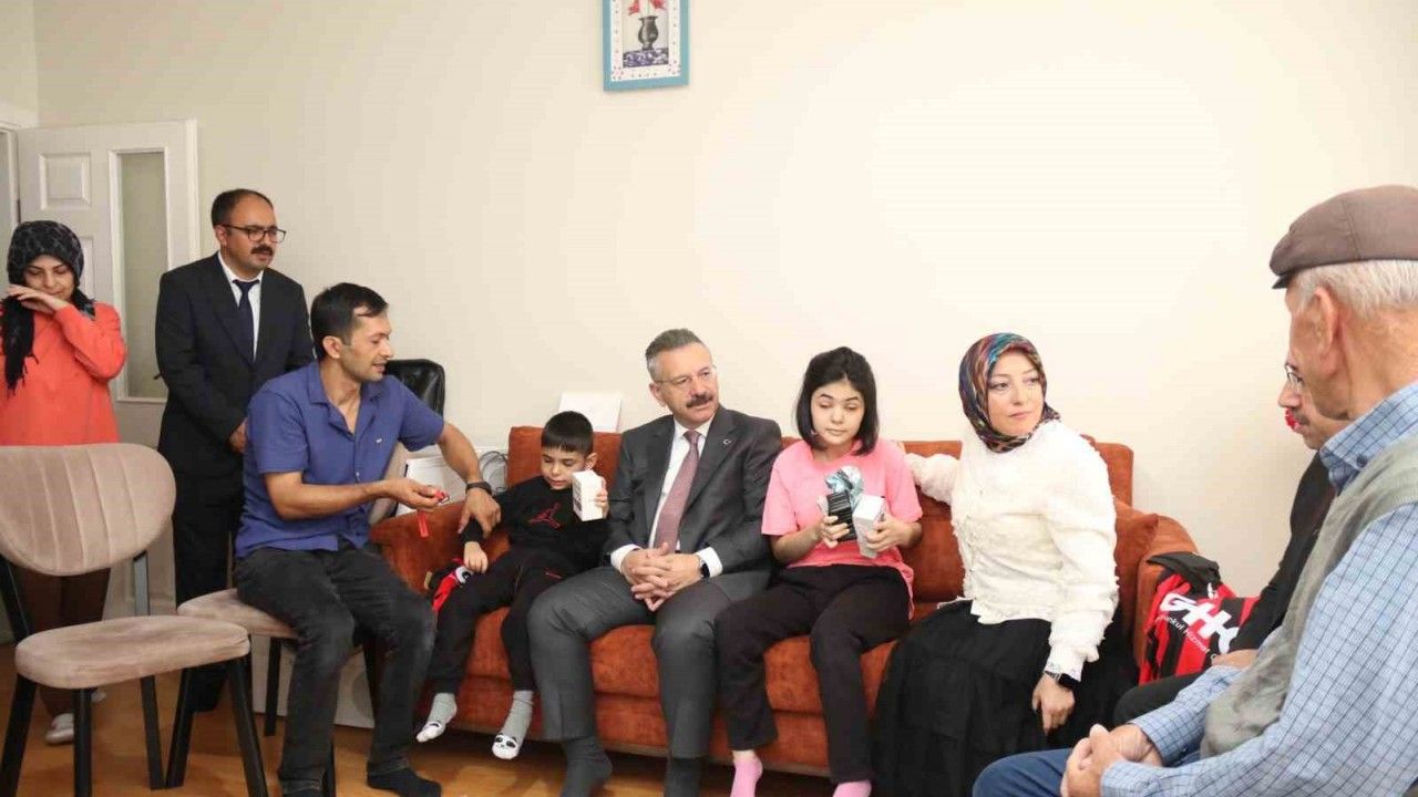 Çocukların yeni eğitim öğretim yılını kutlayan Vali Aksoy, "Özel çocuklarımıza evde eğitim hizmeti vermeye devam ediyoruz. Bu amaçla öğretmenimiz, bu çocuklarımıza eve gelerek eğitim hizmetini veriyor. Biz de bugün çocuklarımızın evde eğitim hizmeti aldığı noktada onları ziyaret etmek, onların hatırını sormak ve başarılar dilemek için İl Milli Eğitim Müdürümüzle beraber geldik. Eğitimde her türlü engeli kaldırmak için büyük bir gayret içerisinde arkadaşlarımızla birlikte çalışıyoruz. Okula gelemeyen öğrencilerimize biz gidiyoruz. Bu noktada öğretmenlerimiz özverili bir şekilde çalışmalarını sürdürüyor. Hiçbir çocuğumuzun eğitim dışı kalmaması için çalışmalarımıza devam edeceğiz" ifadelerini kullandı.