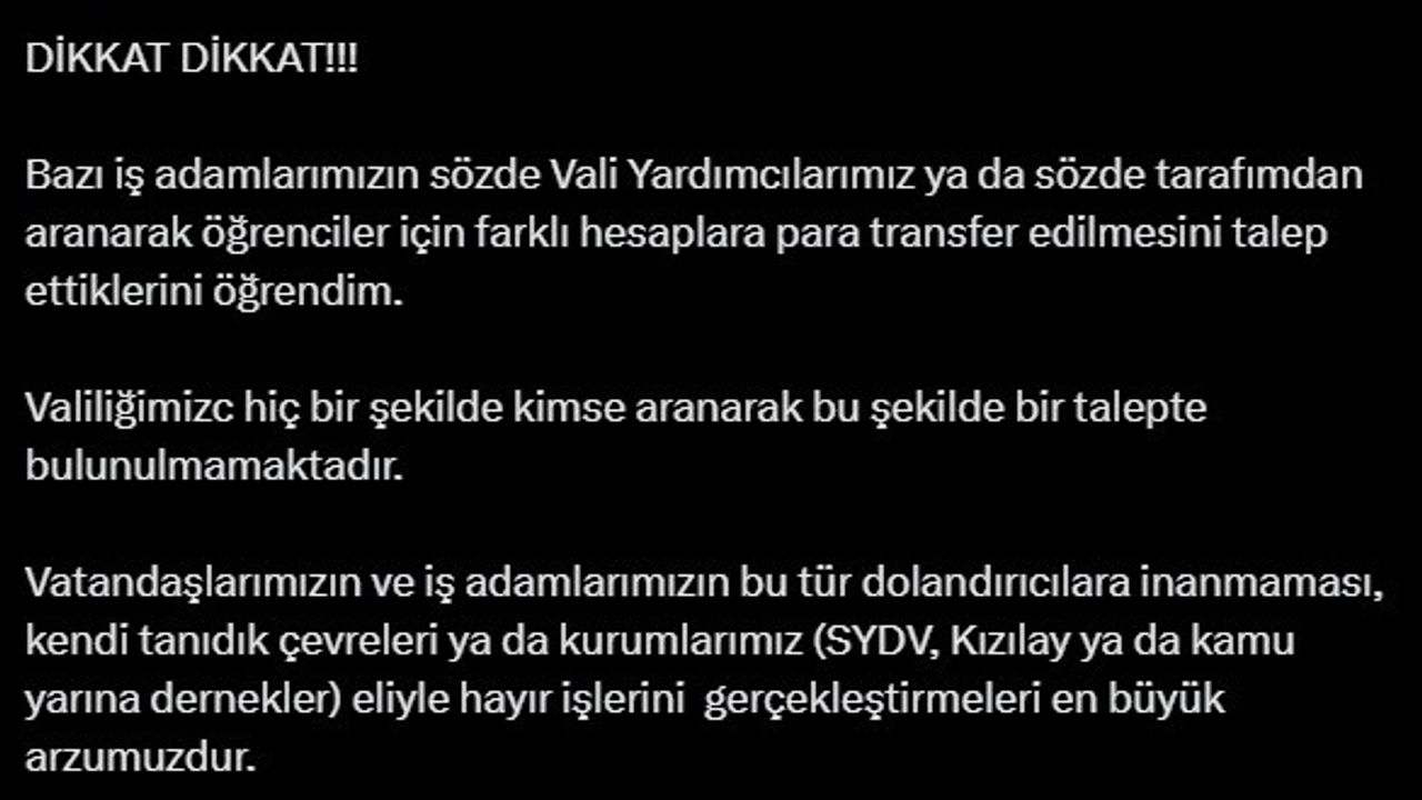Vali Hatipoğlu sosyal medya hesabından yaptığı açıklamada, "Bazı iş adamlarımızın sözde vali yardımcılarımız ya da sözde tarafımdan aranarak öğrenciler için farklı hesaplara para transfer edilmesini talep ettiklerini öğrendim. Valiliğimiz hiç bir şekilde kimseyi aranarak bu şekilde bir talepte bulunulmamaktadır. Vatandaşlarımızın ve iş adamlarımızın bu tür dolandırıcılara inanmaması, kendi tanıdık çevreleri ya da kurumlarımız SYDV, Kızılay ya da kamu yarına dernekler eliyle hayır işlerini gerçekleştirmeleri en büyük arzumuzdur" ifadelerine yer verdi.
