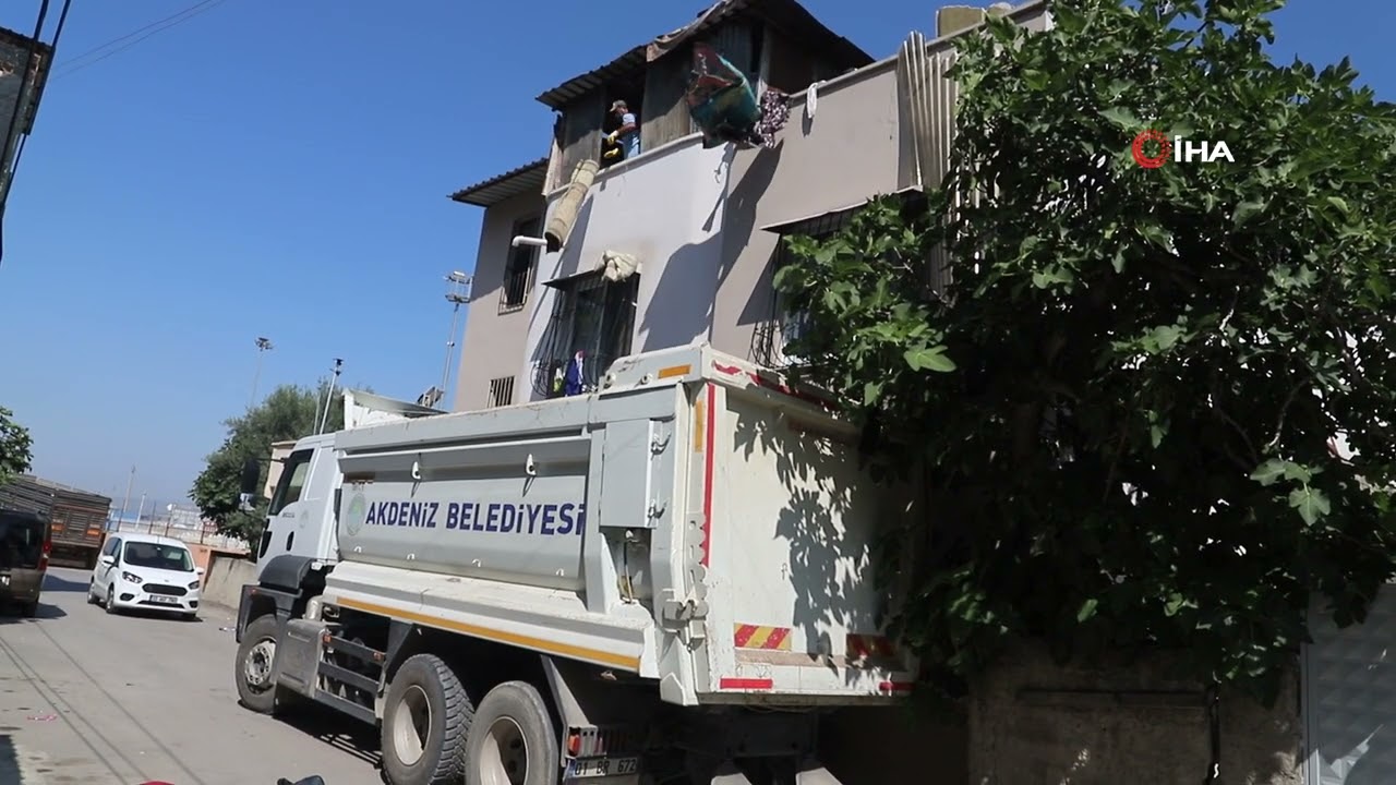 Mersin'in Akdeniz ilçesindeki bir evden kötü koku ve görüntü kirliliği şikayetleri üzerine 2 kamyon çöp çıkarıldı.