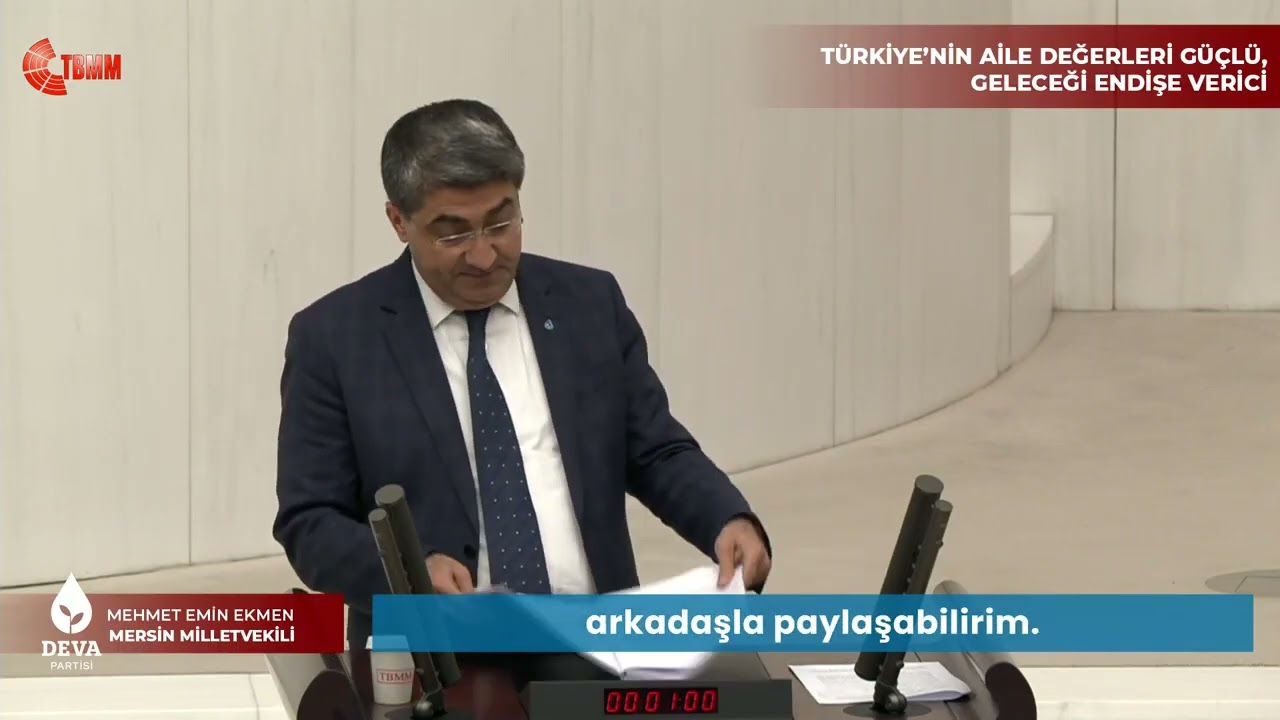 DEVA Partisi Genel Başkan Yardımcısı Mehmet Emin Ekmen, TBMM Genel Kurulu'nda yaptığı konuşmada, ekonomik zorlukların aile kurumunu ve doğurganlık oranlarını olumsuz etkilediğini belirtti.
