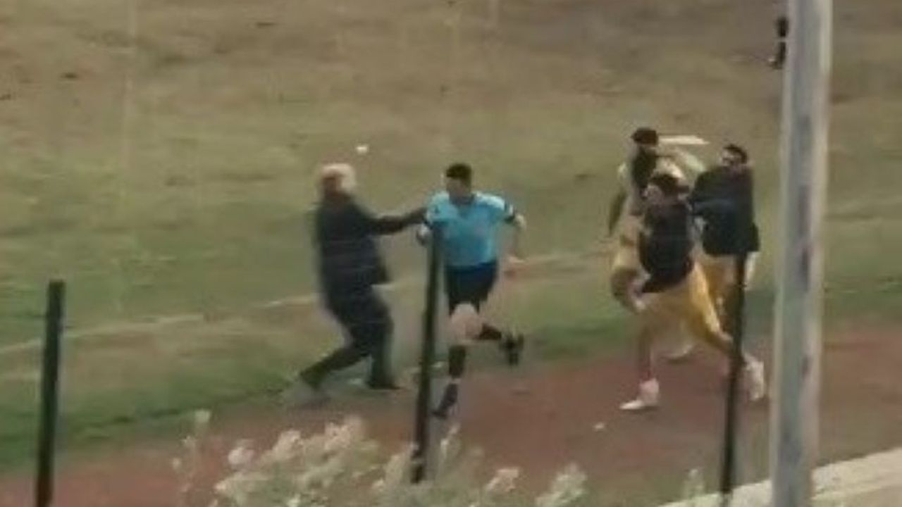 Mersin'de amatör lig karşılaşmasında kırmızı kart gören futbolcu, kramponlarla yan ve orta hakeme saldırdı. Olay anı cep telefonu kamerasına yansıdı.