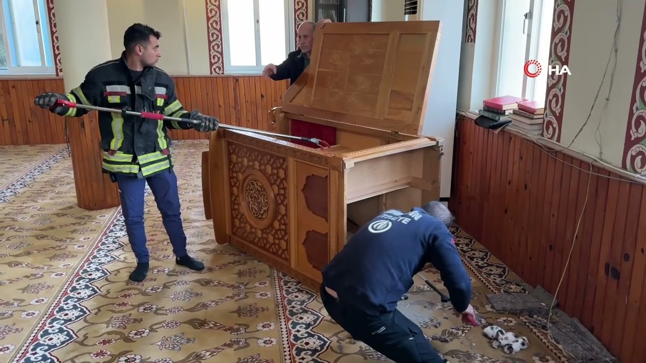 Mersin’de bir camideki vaaz kürsüsünün altına yavrulayan anne kedi, daha güvenli yere taşımak isteyen itfaiye ekiplerine uzun süre direndi