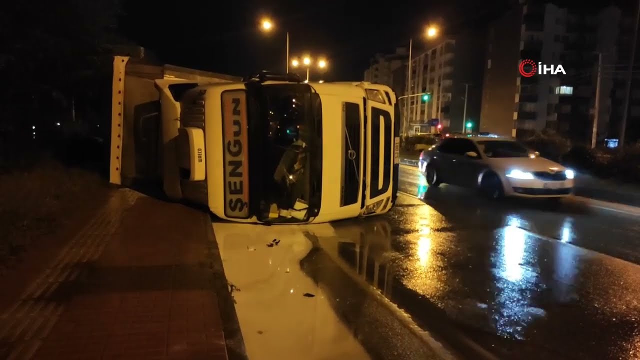 Mersin’in Erdemli ilçesinde sağanak nedeniyle kayganlaşan yolda boya yüklü tır devrildi. Boyalar yola akarken, sürücü kazayı yara almadan atlattı.