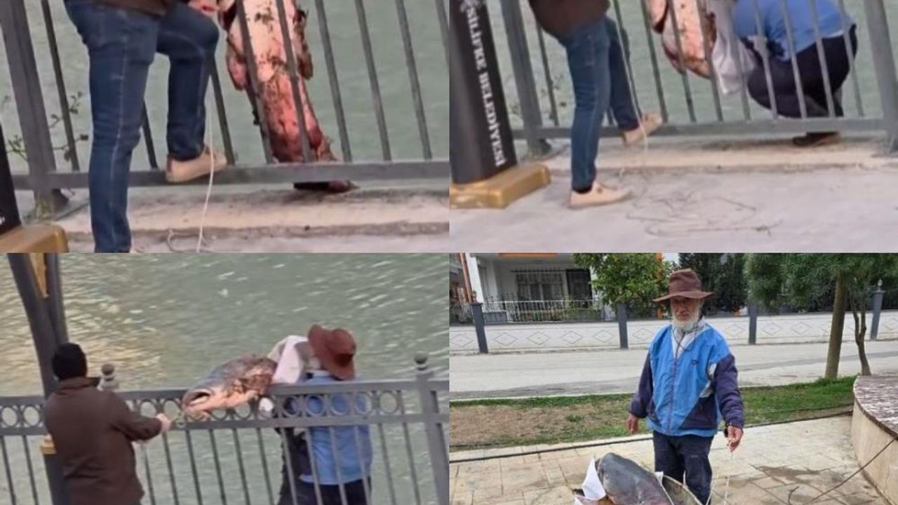 Mersin'de Silifke ilçesinden geçen Göksu Nehri'nde balık tutan bir kişinin yakaladığı dev yayın balığı, çevredeki vatandaşların imece usulü yardımıyla güçlükle kıyıya çıkarıldı.