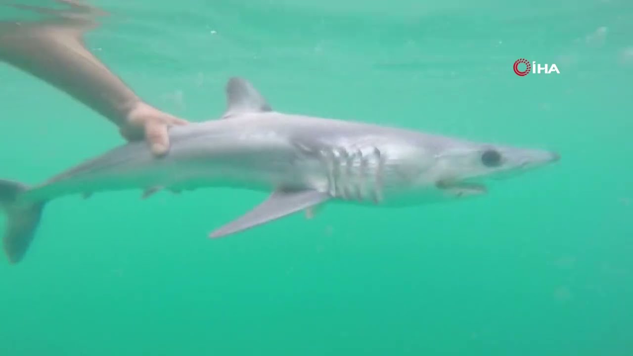 Mersin'de hobi balıkçısı Çınar Küçük, oltasına takılan yavru mako cinsi köpek balığını yüzgecindeki oltayı çıkarıp denize geri bıraktı.