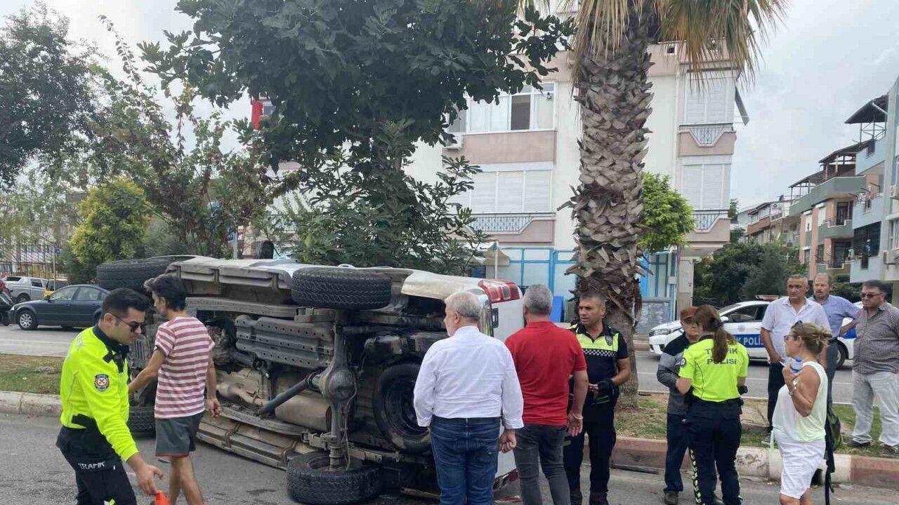 Antalya’da kontrolsüz kavşakta otomobil ile kamyonetin çarpışması sonucu meydana gelen kazada yan yatan kamyonetin sürücüsü kazayı yara almadan atlattı.
