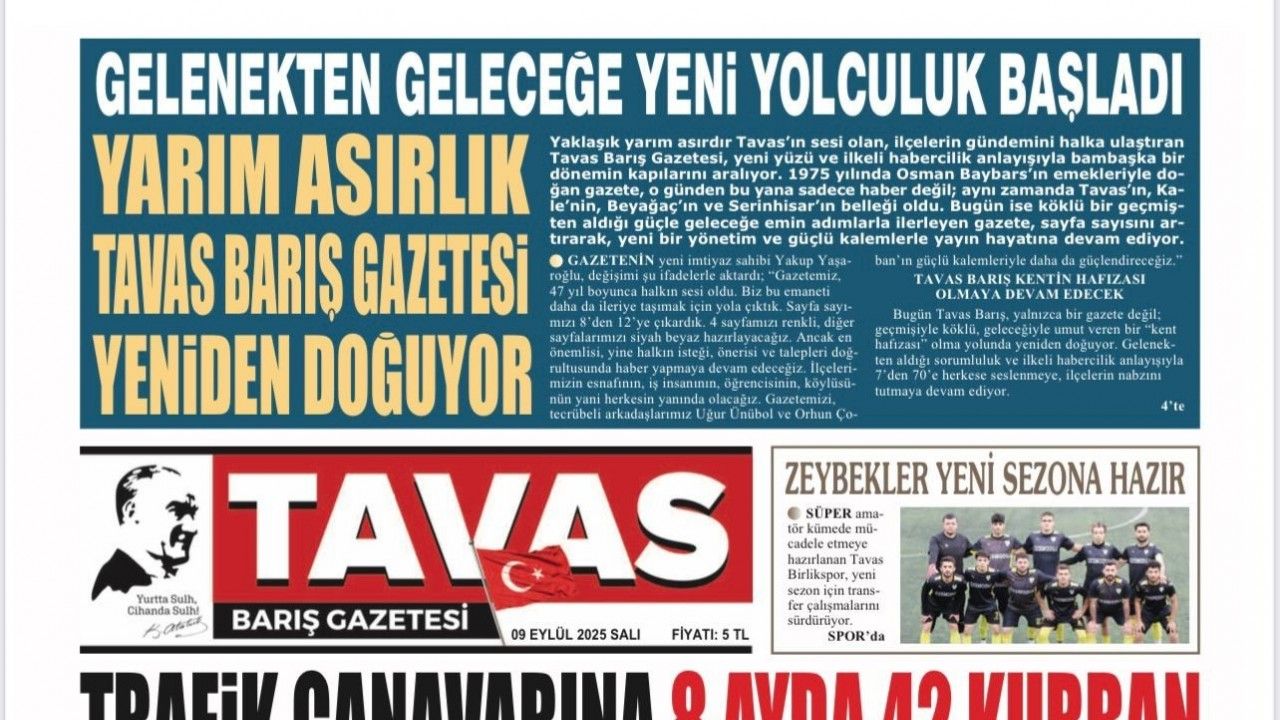 Emine Göker tarafından yürütülen gazetenin imtiyaz sahipliği görevini, yeni süreçte Yakup Yaşaroğlu devraldı. Haftada 2 kez olmak üzere Salı ve Cuma günleri yayımlanacak Tavas Barış Gazetesi artık 12 sayfa olacak. Gazetenin ilk ve son sayfası ile 6 ve 7. Sayfaları renkli, iç sayfalar ise siyah-beyaz hazırlanacak. Bu değişiklikle birlikte gazete, hem görsel anlamda daha zengin bir içerik sunacak hem de okurlarına daha geniş bir haber yelpazesi ulaştıracak.