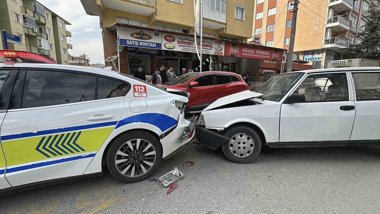 Burdur'da yaya geçidinde yayaya yol vermek için yavaşlayan trafik polisinin aracına, Tofaş otomobil arkadan çarptı.
