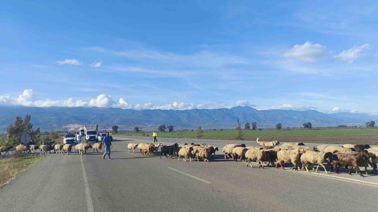 Hatay’da yayla dönüşünde kara yolunu kullanmak zorunda kalan koyun sürüsü, polis ekiplerinin destekleriyle olumsuzluk yaşanmadan 2 kilometrelik yolu katetti. Koyunların kara yolundan geçişi esnasında korna seslerinin yerine yankılanan çan sesleri renkli görüntüler oluşturdu.