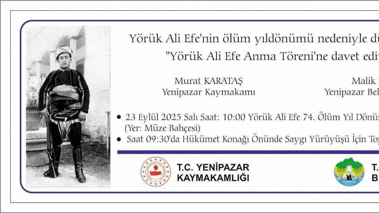 Yenipazar Kaymakamlığı ve Yenipazar Belediyesi tarafından düzenlenecek anma programı, 23 Eylül 2025 Salı günü gerçekleştirilecek. Etkinlik saat 09.30’da Hükümet Konağı önünden başlayacak saygı yürüyüşü ile başlayacak. Katılımcılar, kortej halinde Yörük Ali Efe Müzesi’ne yürüyecek. Ardından müze bahçesinde saat 10.00’da anma programı düzenlenecek.