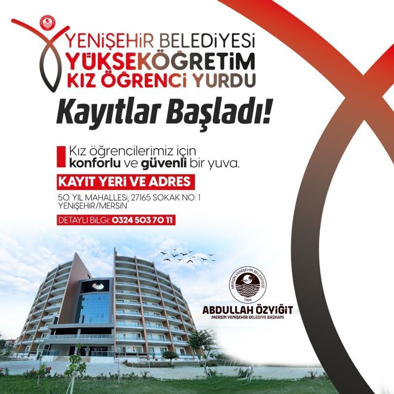 Bu yıl sadece kız öğrencilere barınma hizmeti sunacak olan 50. Yıl Mahallesi’ndeki Yenişehir Belediyesi Yükseköğretim Kız Öğrenci Yurdu’nda kayıtlar başladı. 78 adet 2+1 ve 18 adet 1+1 daireden oluşan yurtta yarı olimpik yüzme havuzu, çok amaçlı salon, kütüphane, ders çalışma odaları, revir, hobi bahçeleri ile sanat ve spor alanları da bulunuyor. Öğrenciler kayıt işlemleri hakkında daha fazla bilgi almak ve başvuru süreciyle ilgili detayları öğrenmek için 0324 503 70 11 telefon numarasını arayabilecek. Kayıtlar ise şahsen olarak yurtta yapılacak. Yenişehir Belediyesi Yükseköğretim Kız Öğrenci Yurdu, 50. Yıl Mahallesi 27165 numaralı sokakta yer alıyor.