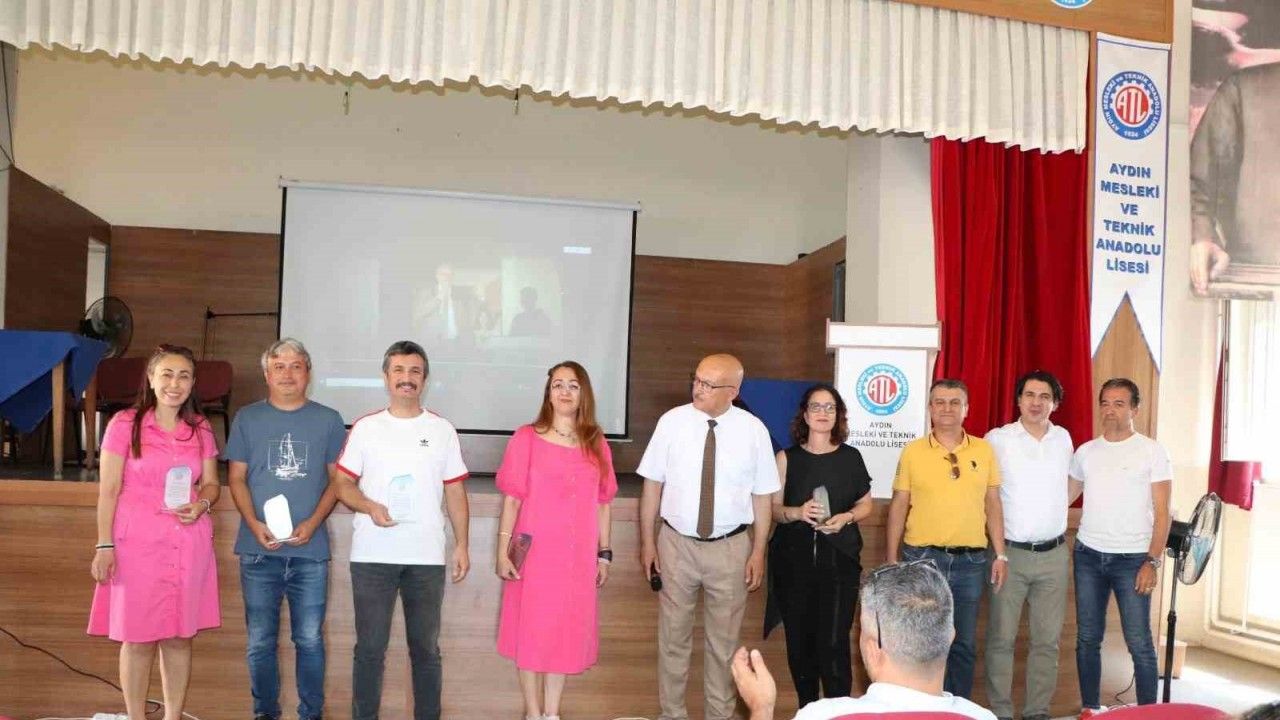 Aydın Mesleki ve Teknik Anadolu Lisesi’nde yıl sonu öğretmenler kurulu toplantısında yeni görev yerlerine atanan okul idarecisi ve öğretmenlere plaket takdim edildi.