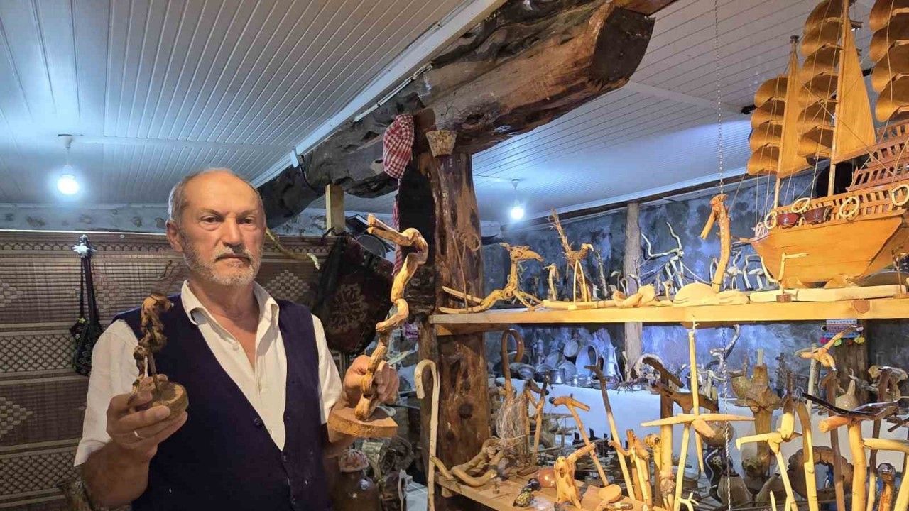 Yozgat’ın Aydıncık ilçesinde yaşayan Raşit Öztürk, ormanlık alandan topladığı ağaç parçalarına hayal gücüyle şekil veriyor.
