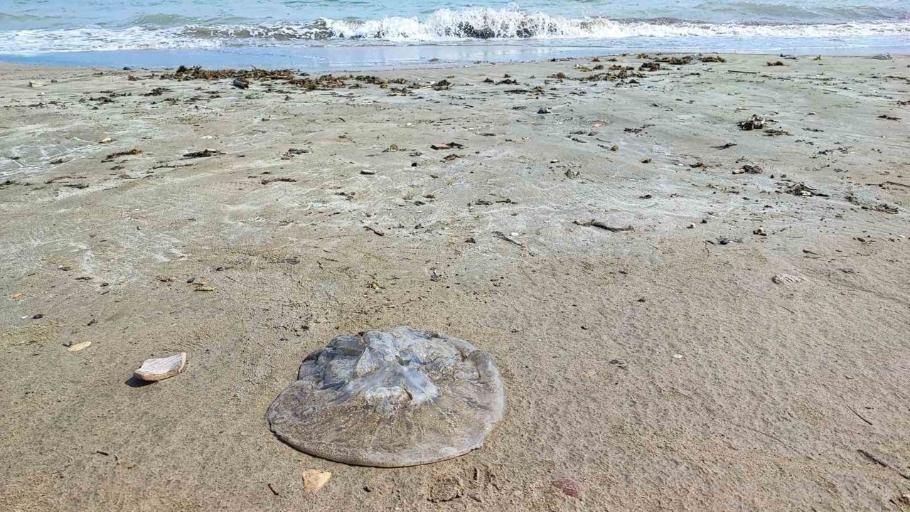 Adana'nın Yumurtalık ilçesinde sahil şeridi denizanalarıyla kaplandı. Onlarca denizanasının kıyıya vurduğu bölgede, deniz kenarı adeta denizanalarından geçilmez hale geldi.