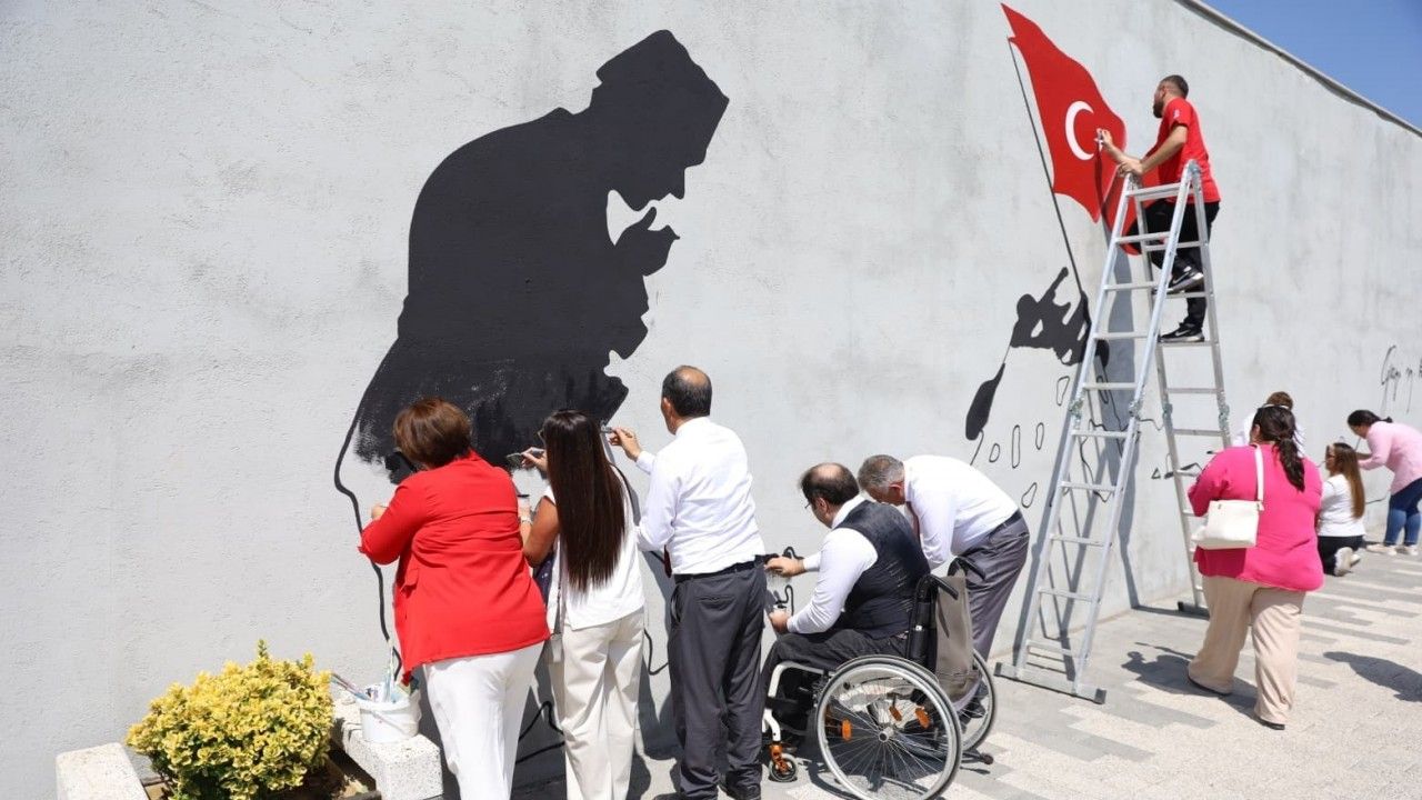 Bursa Büyükşehir Belediyesi tarafından 30 Ağustos Zafer Bayramı etkinlikleri kapsamında eline boya fırçası olan şehit yakınları ve gaziler, zafer ruhunu Mihraplı Şehitler Abidesi giriş yolundaki duvarlara yansıttı.