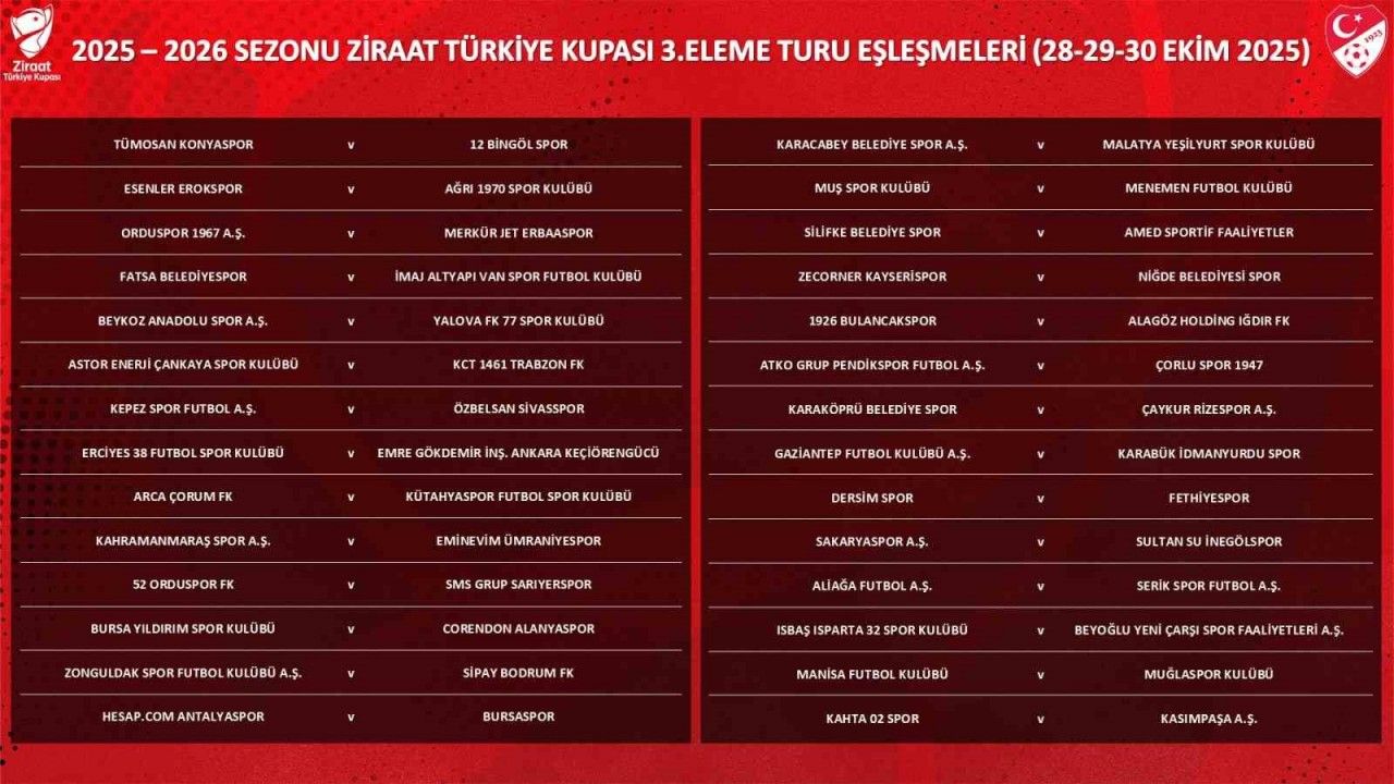 Ziraat Türkiye Kupası’nda 3. eleme turu maçları; 28-29-30 Ekim tarihlerinde oynanacak. Eşleşmelerde kazanan taraf, 4. tura yükselmeye hak kazanacak.