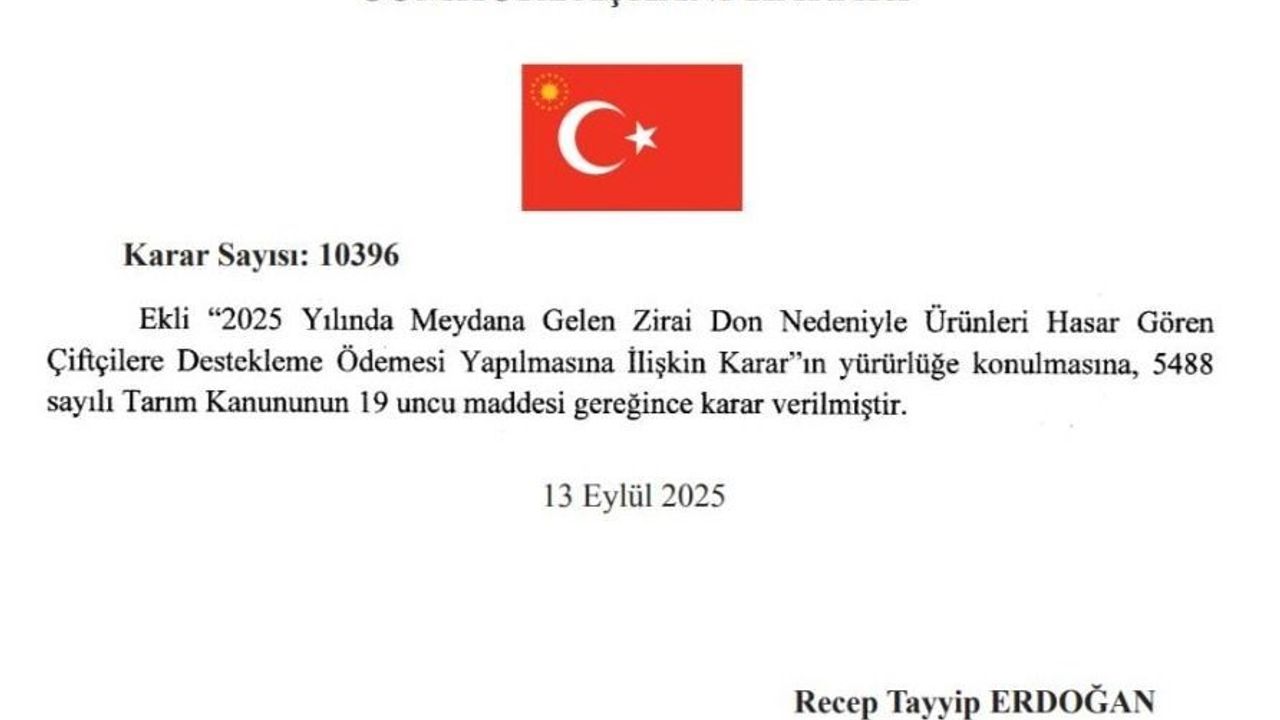 Cumhurbaşkanı Recep Tayyip Erdoğan’ın imzasıyla yayımlanan karara göre, 2025 yılında meydana gelen zirai don nedeniyle meyve alanlarında ürünleri zarar gören çiftçilere destekleme ödemesi yapılacak. Resmi Gazete’nin 14 Eylül 2025 tarihli sayısında yayımlanan karar ile, bu yıl meydana gelen zirai don olaylarından etkilenen ve ürünlerinde yüzde 20’nin üzerinde hasar tespit edilen çiftçiler, destekleme ödemelerinden faydalanabilecek. Masraf hesaplamalarında 1 Eylül 2024’ten 13 Nisan 2025’e kadar üreticinin yaptığı masraflar dikkat alındı.