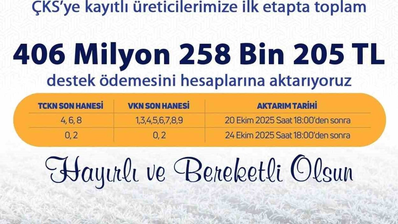 Denizli İl Tarım ve Orman Müdürlüğü tarafından yapılan açıklamada, "Denizli için zirai dondan etkilenen, tarım sigortası bulunmayan ve Çiftçi Kayıt Sistemine (ÇKS) kayıtlı üreticilere ilk etapta 406 milyon 258 bin 205 TL destek ödemesini hesaplarına aktarıyoruz" ifadeleri yer aldı. TC kimlik numarası son hanesi 4,6,8 vergi kimlik numarasının sonu 1,3,4,5,6,7,8,9 olanlar için 20 Ekim Pazartesi günü saat 18.00’den sonra aktarım yapılacağı ifade edildi. TC kimlik numarası ve vergi kimlik numarasının son hanesi 0 ve 2 olanlar için ise 24 Ekim Cuma günü saat 18.00’den sonra aktarım yapılacağı ifade edildi.